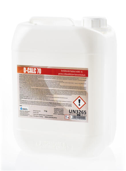 D-CALC 70 fertőtlenítő hatású vízkőoldó és penészeltávolító 5 kg Fertőtlenítő hatású, kellemes illatú, habzó, savas kémhatású folyékony vízkő- és penész eltávolítószer. Járólapok, csempék, mosdók, WC kagylók, csaptelepek, stb. valamint berendezések, gépek, munkafelületek, padozat tisztítására, vízkőmentesítésére, fertőtlenítésére alkalmazható az élelmiszeripar, egészségügyi intézmények, a vendéglátás és a közintézmények területein.