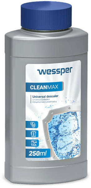 Wessper Clean Max 250 ml Univerzális Wessper CleanMax 250 ml vízkőoldó eszpresszógépek / félautomata gépek és egyéb háztartási készülékek vízkőmentesítéséhez. A vízkőoldó rendkívül hatékony, biztonságos és könnyen használható. Szükség esetén használható - hatékony vízkőmentesítéshez vagy 250 csésze kávé elkészítése után, a víz keménységétől függően.